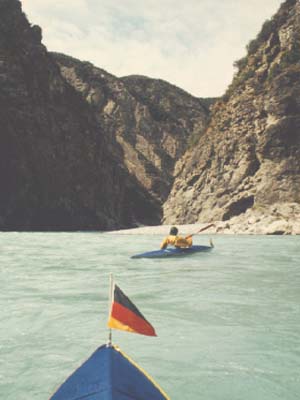 Rangitata: The high volume whitewater of even the lower part challenges every folding boat kayaker. |